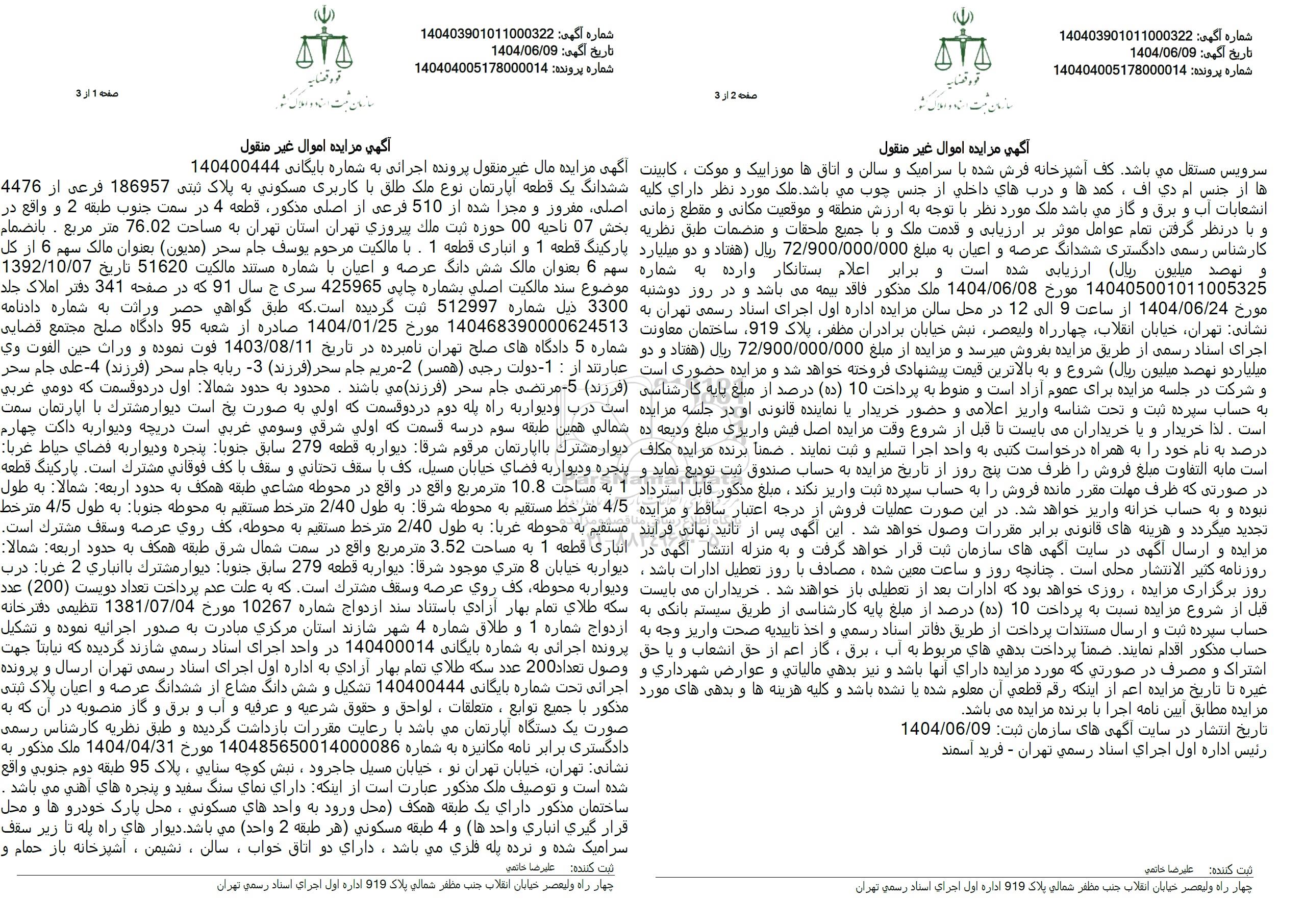 موضوع مزایده : یک قطعه آپارتمان مسکونی تحت پلاک ثبتی 186957 فرعی از 4476 اصلی، مفروز و مجزی شده از 510 فرعی به ارزش 72.900.000.000 ریال