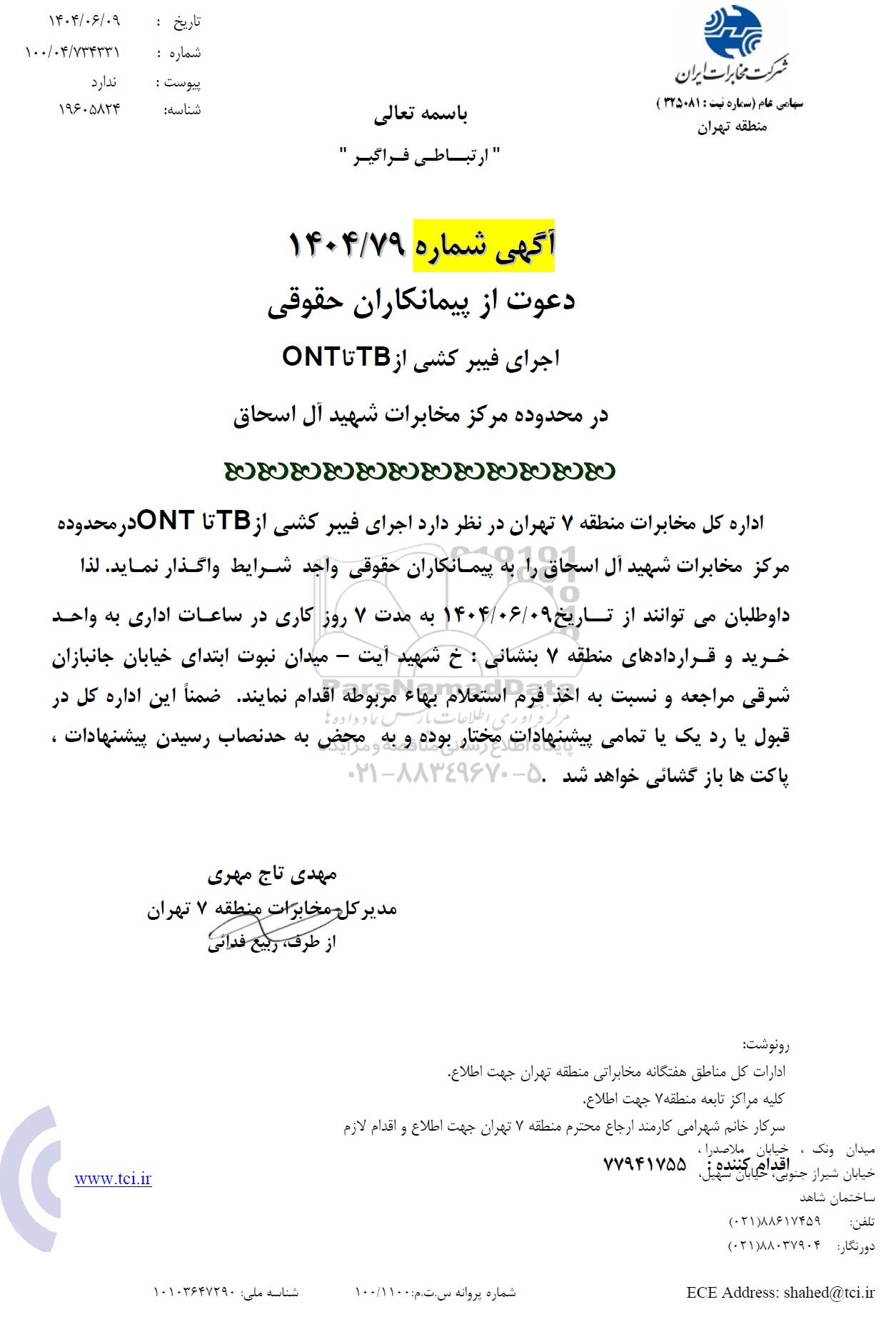اداره کل مخابرات منطقه 7 تهران در نظر دارد اجرای فیبر کشی از TB تا ONT در محدوده مرکز مخابرات شهید آل اسحاق را به پیمانکاران حقوقی واجد شرایط واگذار نماید. لذا داوطلبان می توانند از تاریخ 1404.6.9 به مدت 7 روز کاری در ساعات اداری به واحد خرید و قراردادهای منطقه 7 بنشانی : خ شهید آیت - میدان نبوت - ابتدای خیابان جانبازان شرقی مراجعه و نسبت به اخذ فرم استعلام بهاء مربوطه اقدام نمایند. ضمناً این اداره کل در قبول یا رد یک یا تمامی پیشنهادات مختار بوده و به محض به حد نصاب رسیدن پیشنهادات ، پاکت ها بازگشایی خواهند شد.