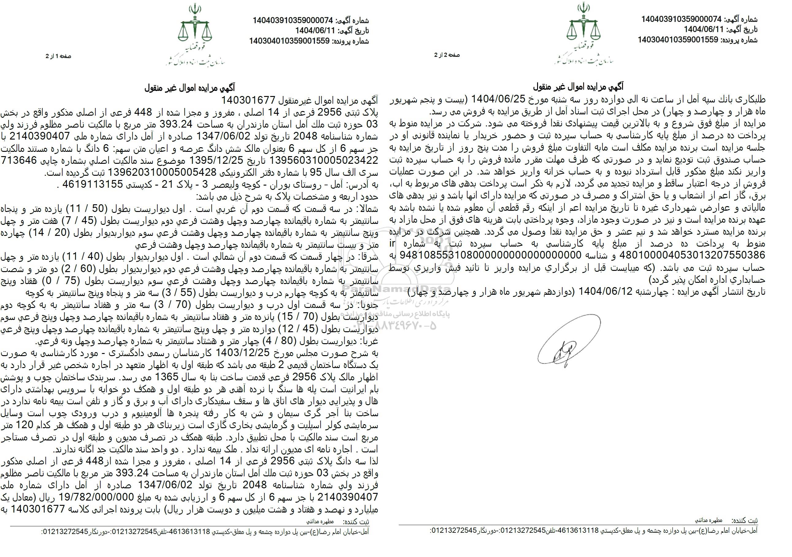 مزایده فروش پلاک ثبتی 2956 فرعی از 14 اصلی  , مزایده فروش پلاک ثبتی 2956 فرعی از 14 اصلی