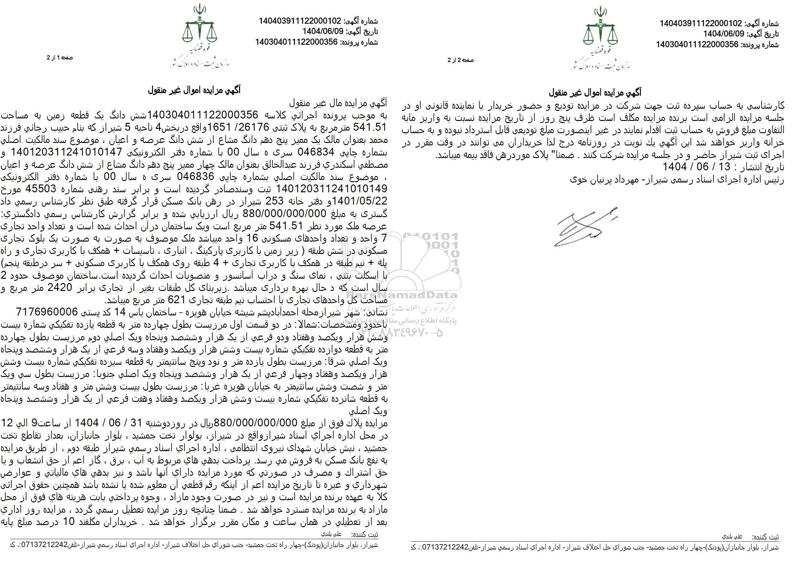 مزایده عمومی مزایده یک قطعه زمین به پلاک ثبتی 1651.26176 برگزار میگردد. از کلیه افراد متخصص و شرکتهای واجد شرایط دعوت به عمل میآید تا در این مزایده با کد خبرگزاری پارس نماد : 9490932 شرکت نمایند تاریخ شروع مزایده : 1404/06/11 مهلت شرکت در مزایده: تا پایان روز 1404/06/31