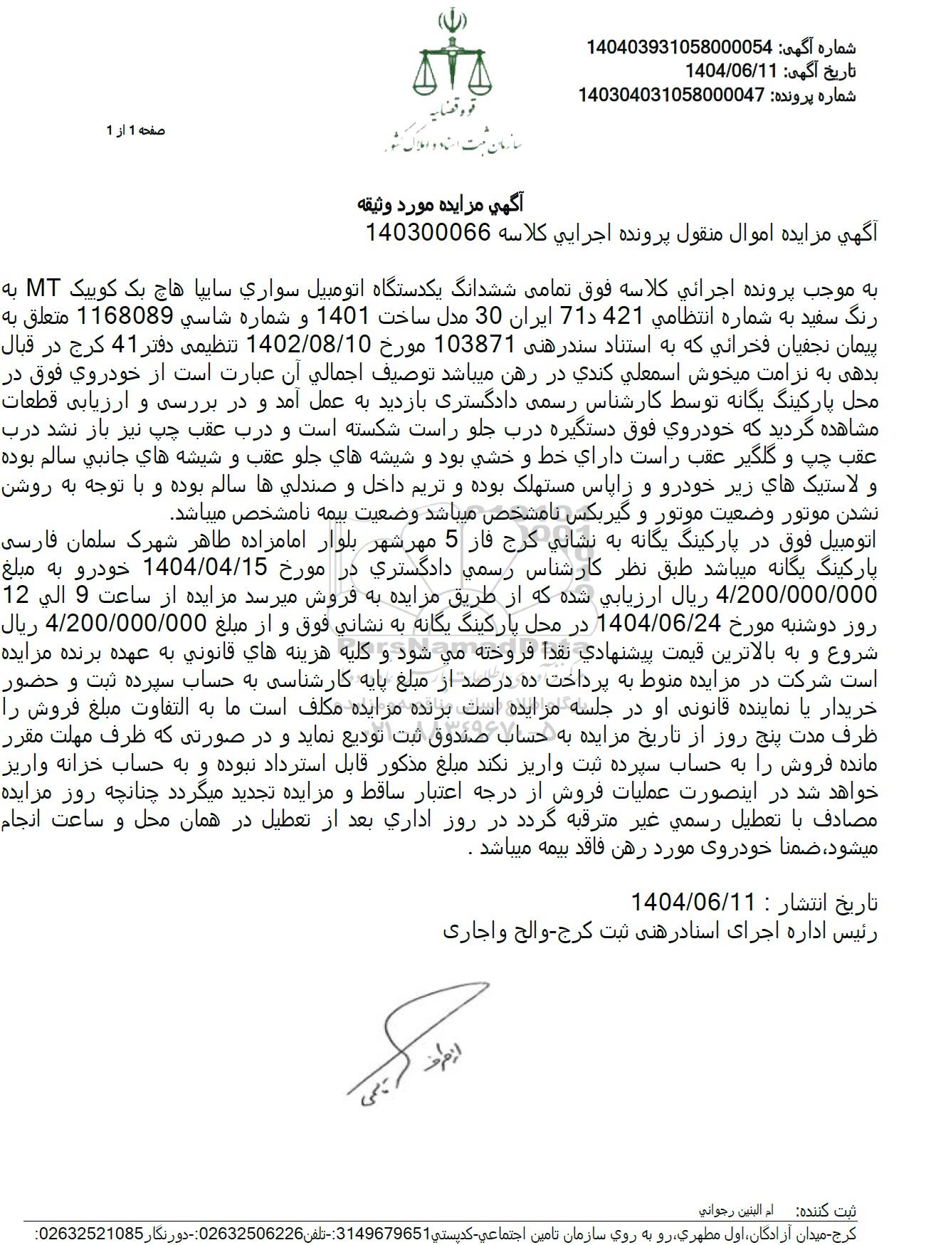 مزایده ششدانگ یک دستگاه اتومبیل سواری سایپا هاچ بک کوییک MT