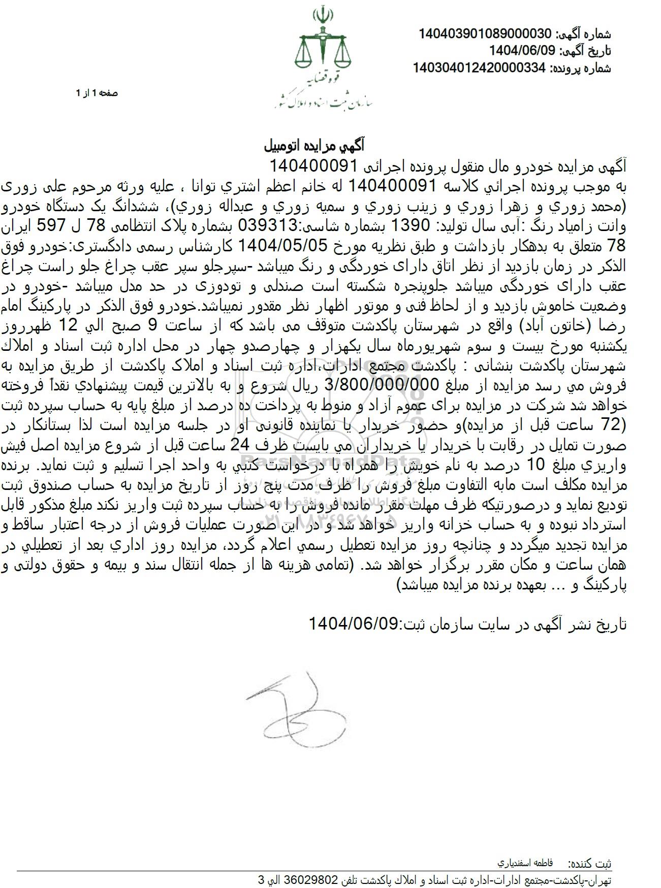 مزایده فروش ششدانگ یک دستگاه خودرو وانت زامیاد آبی سال تولید 1390 به ارزش 3.800.000.000 ریال