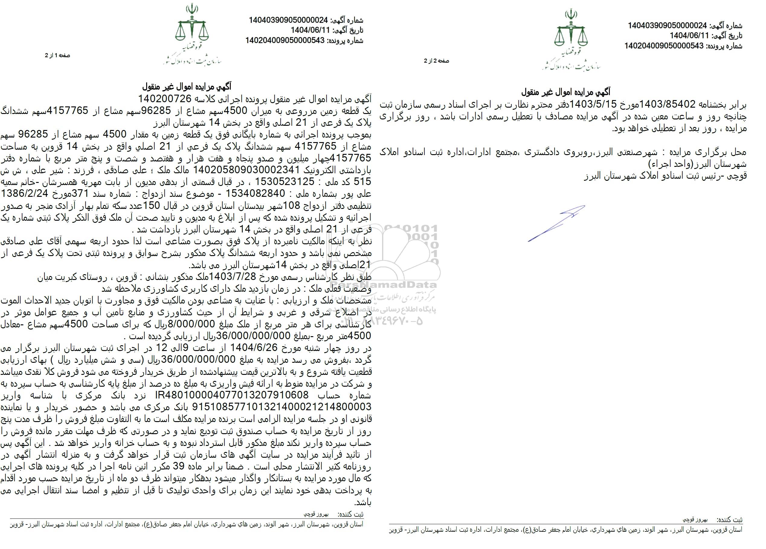 مزایده یک قطعه زمین مزروعی 4500 سهم مشاع از 996285 ششدانگ, مزایده یک قطعه زمین مزروعی 4500 سهم مشاع از 996285 ششدانگ