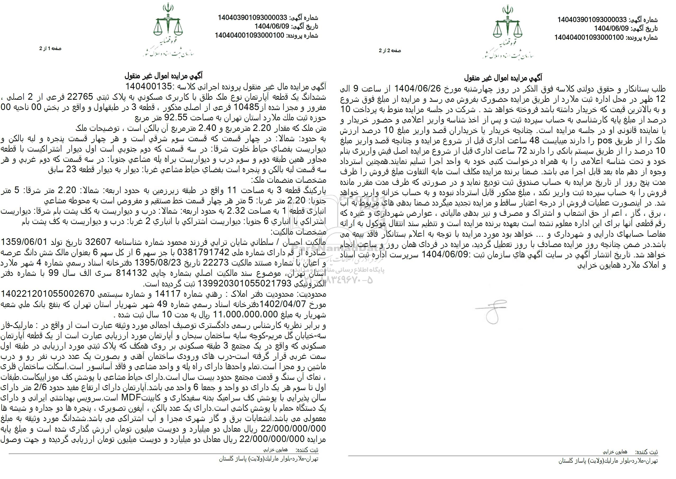 مزایده ششدانگ یک قطعه آپارتمان مسکونی پلاک ثبتی 22765 , مزایده ششدانگ یک قطعه آپارتمان مسکونی پلاک ثبتی 22765