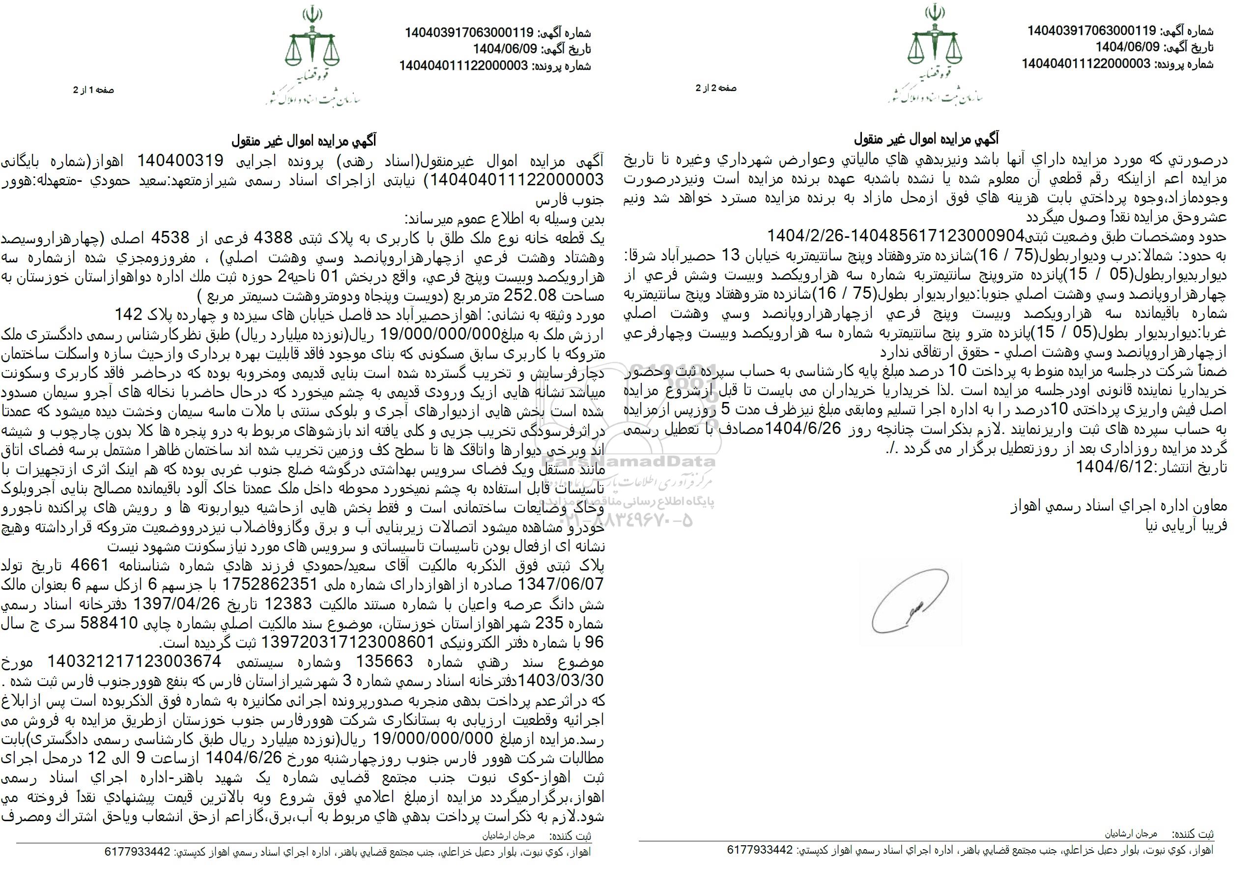 مزایده یک قطعه خانه تحت پلاک ثبتی 4388 فرعی از 4538 اصلی به مساحت 252.08 مترمربع