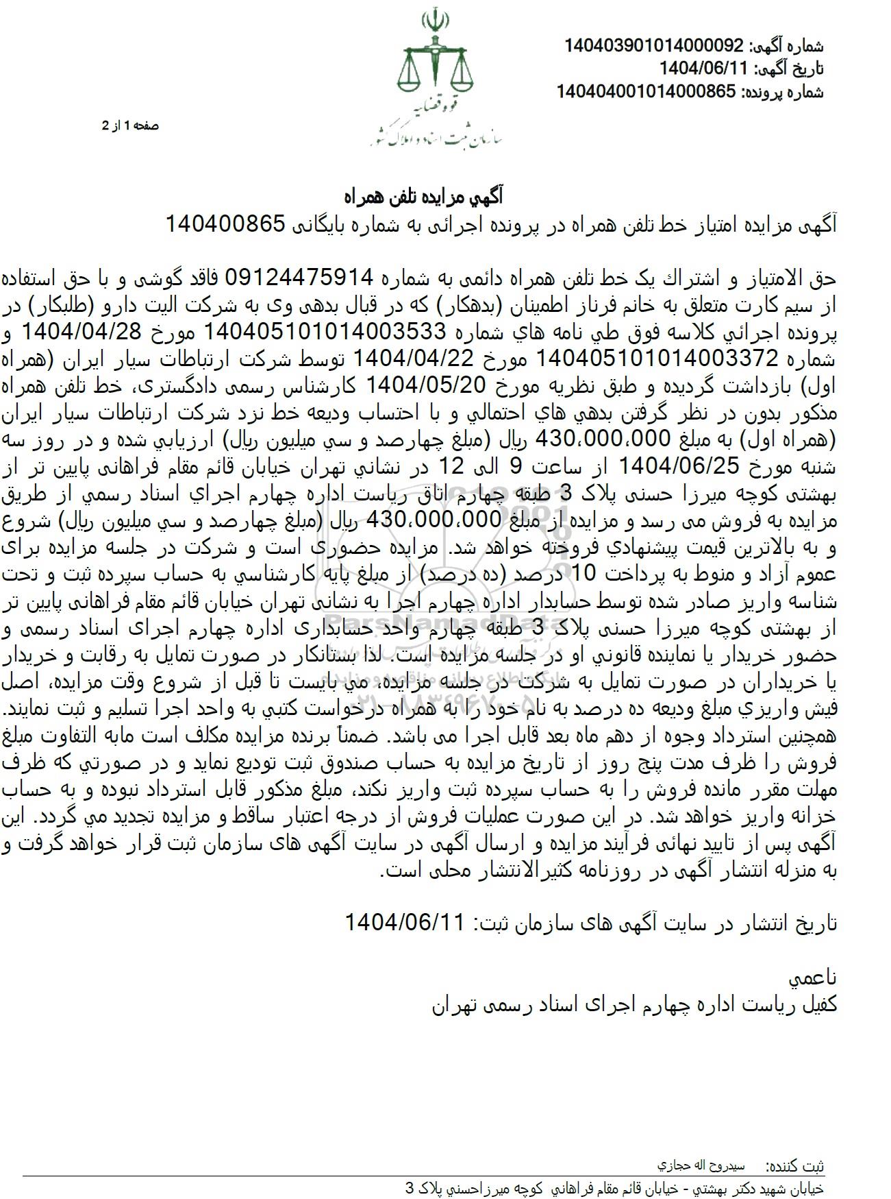 مزایده امتیاز خط تلفن همراه دائمی شماره 091264475914