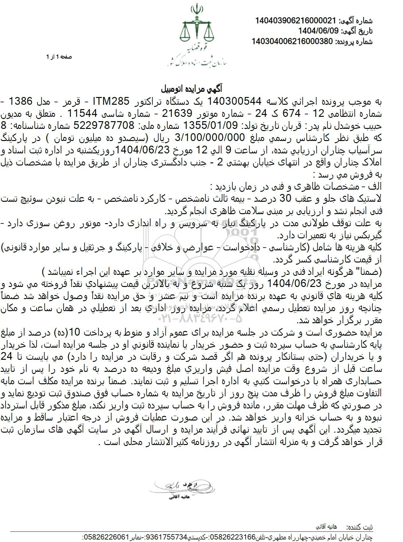 مزایده فروش یک دستگاه تراکتور ITM285 -قرمز - مدل 1386 به ارزش 3.100.000.000 ریال