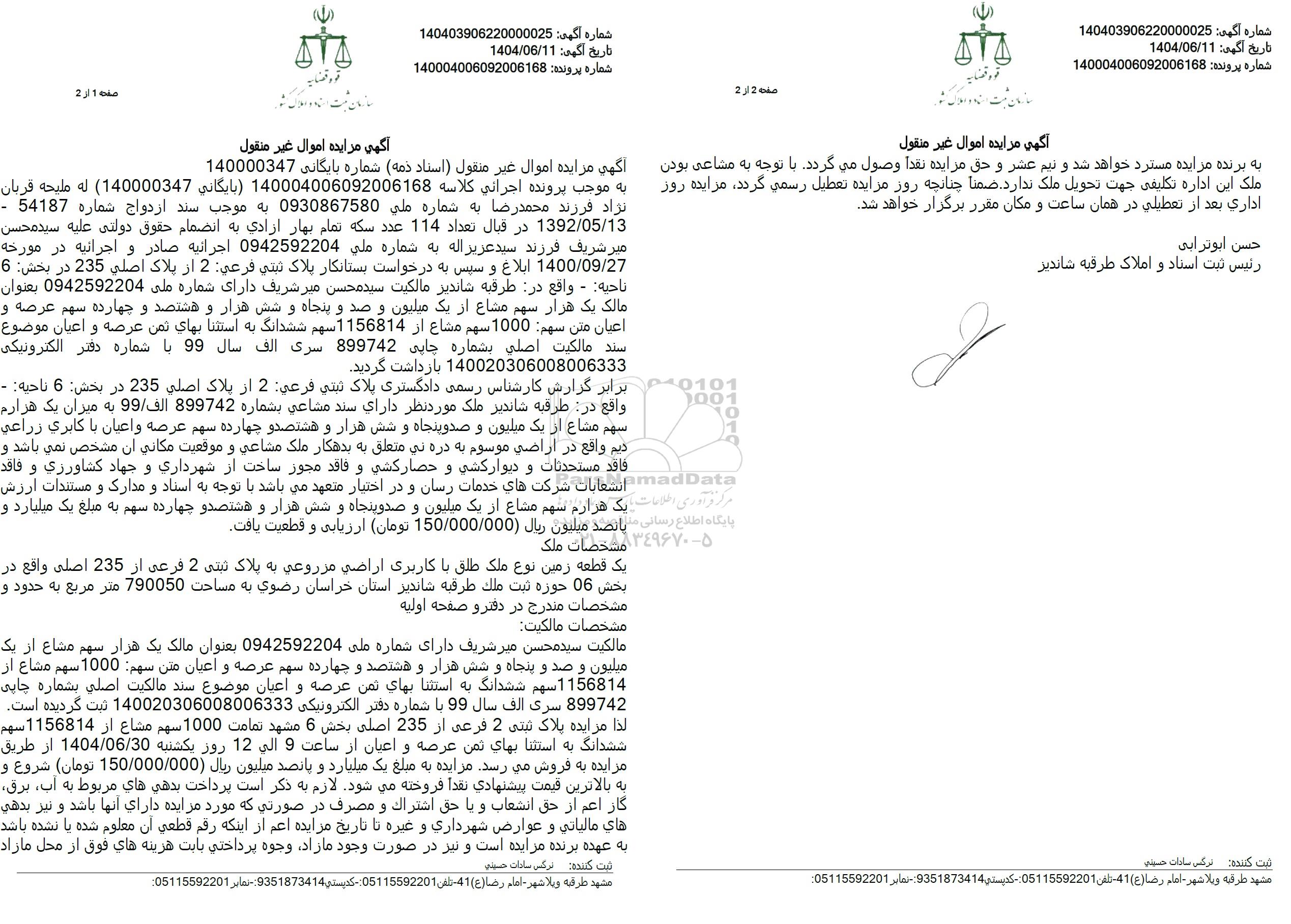 مزایده فروش پلاک ثبتی فرعی 2 از پلاک اصلی 235 , مزایده فروش پلاک ثبتی فرعی 2 از پلاک اصلی 235