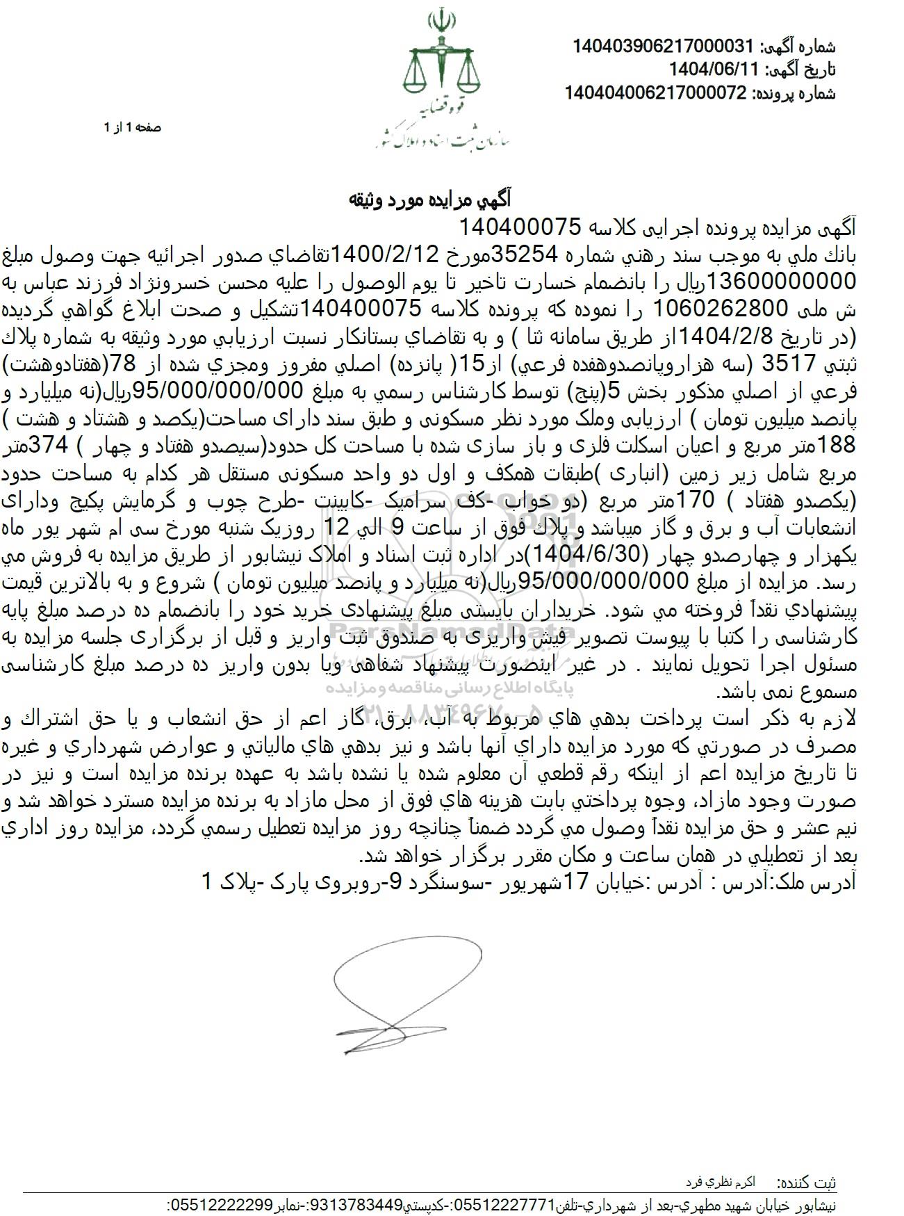 موضوع مزایده : شماره پلاک ثبتی 3517 از 15 اصلی مفروز و مجزی شده از 78 فرعی از اصلی مذکور بخش 5 به ارزش 95.000.000.000 ریال ( نه میلیارد و پانصد میلیون تومان)