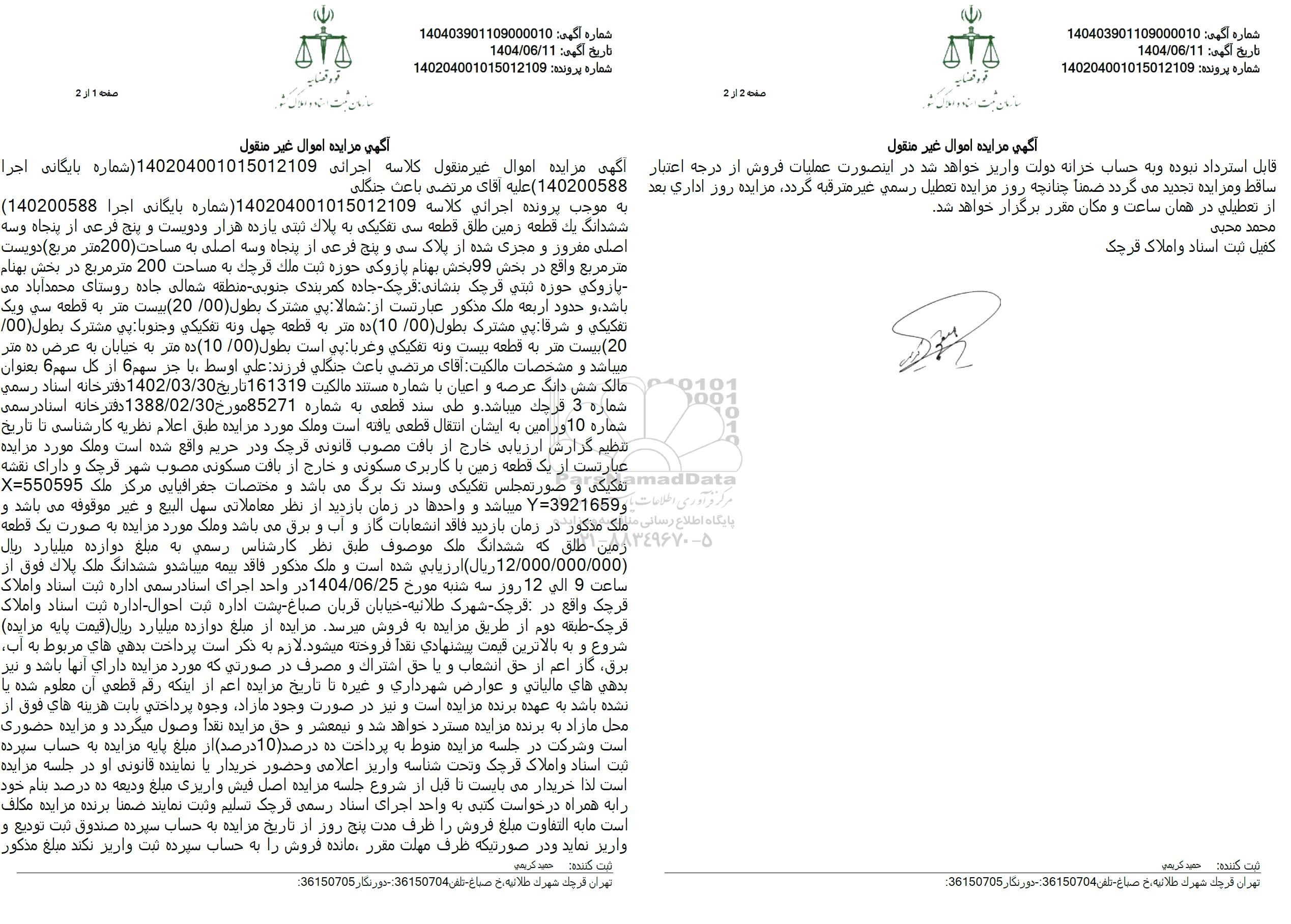5 مزایده دودانگ مشاع از ششدانگ یک قطعه زمین نوع ملک طلق به پلاک ثبتی 10868 فرعی از 46 اصلی 9721414 1404/07/27 new not special not payed تهران