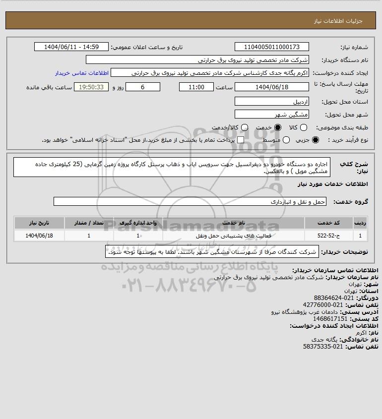 شرح کلی نیاز: اجاره دو دستگاه خودرو دو دیفرانسیل جهت سرویس ایاب و ذهاب پرسنل کارگاه پروژه زمین گرمایی (25 کیلومتری جاده مشگین مویل ) و بالعکس.