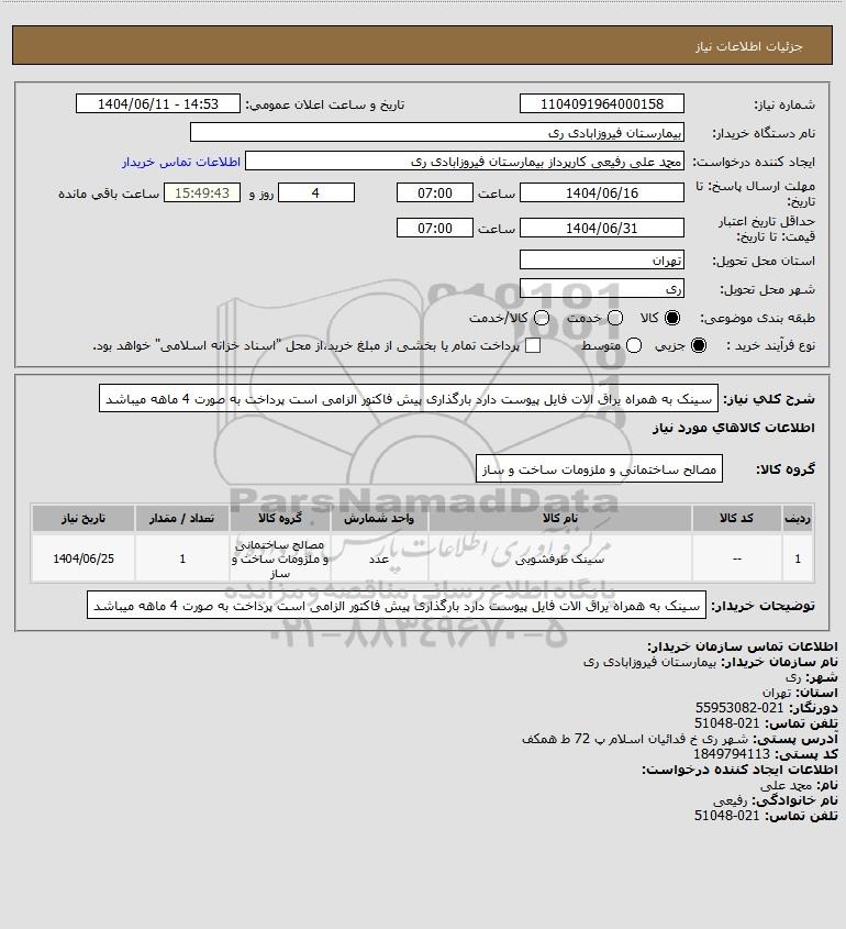 استعلام سینک به همراه یراق الات فایل پیوست دارد بارگذاری پیش فاکتور الزامی است پرداخت به صورت 4 ماهه میباشد, استعلام سینک به همراه یراق الات فایل پیوست دارد بارگذاری پیش فاکتور الزامی است پرداخت به صورت 4 ماهه میباشد