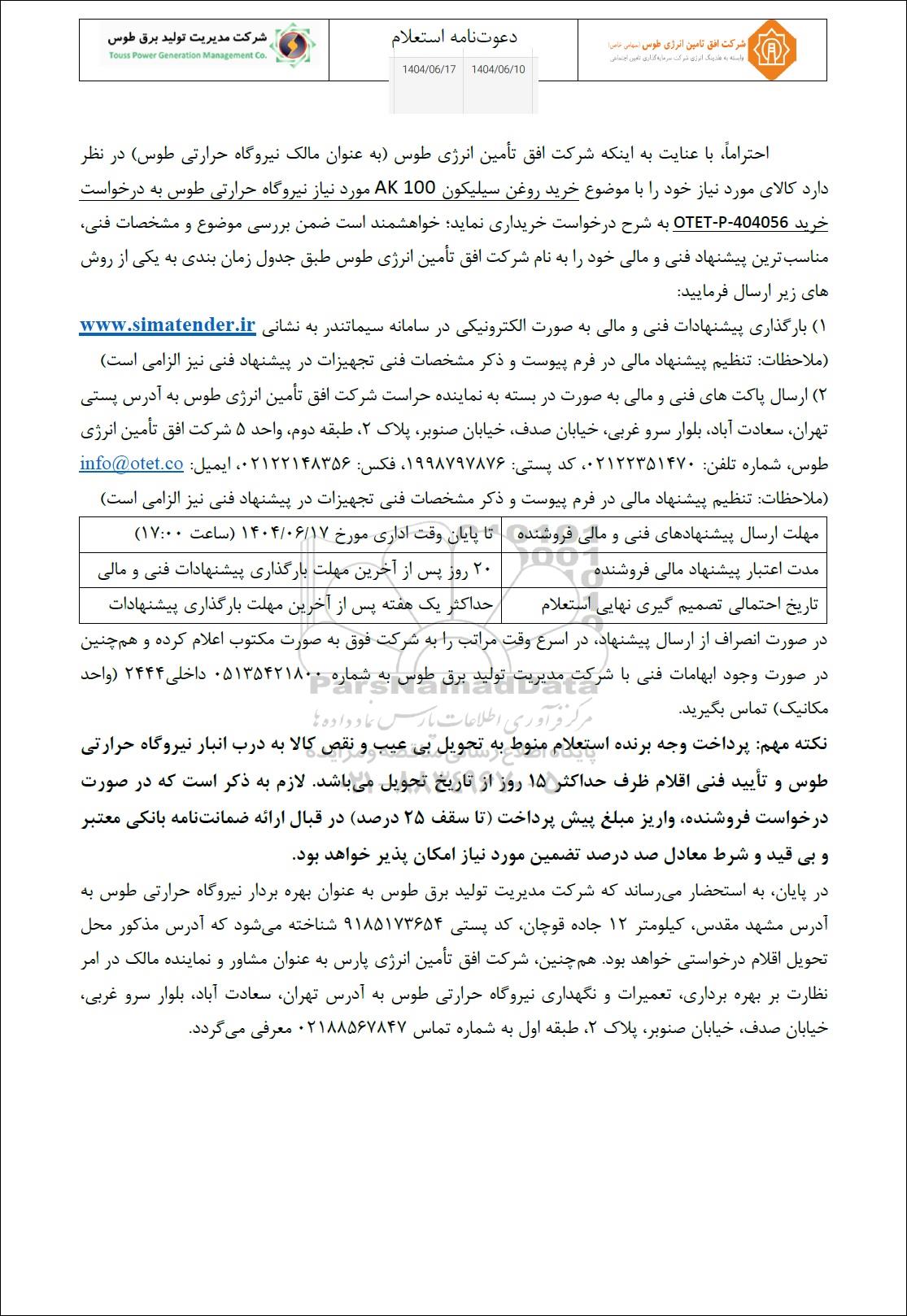 احتراماً با عنایت به اینکه شرکت افق تأمین انرژی طوس به عنوان مالک نیروگاه حرارتی طوس در نظر دارد کالای مورد نیاز خود را با موضوع خرید  خرید روغن سیلیکون ak 100 مورد نیاز نیروگاه حرارتی طوس به درخواست خرید 404056-OTET-P به شرح درخواست خریداری نماید خواهشمند است ضمن بررسی موضوع و مشخصات فنی مناسب ترین پیشنهاد فنی و مالی خود را به نام شرکت افق تأمین انرژی طوس طبق جدول زمان بندی به یکی از روش های زیر ارسال فرمایید