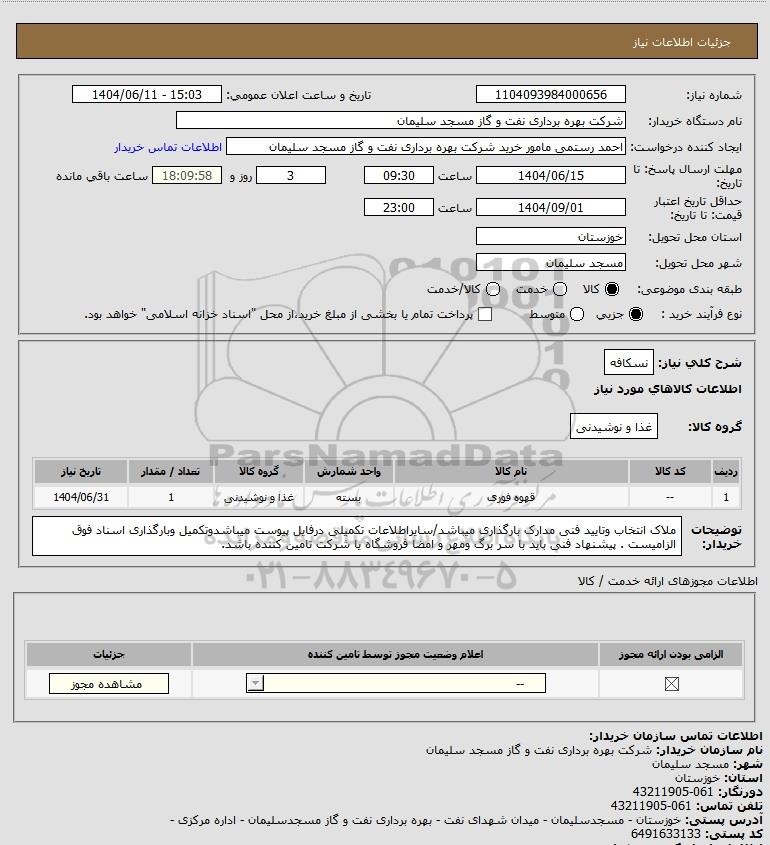 دانلود اسناد مناقصهاستعلام بها و موضوع استعلام استعلام نسکافه به اطلاع کلیه شرکتها و افراد متخصص واجد شرایط میرساند، آگهی گذار در نظر دارد از طریق استعلام بها، نسبت به انتخاب و دریافت پیشنهادات اقدام نماید. این استعلام با کد آگهی ثبت شده در سامانه خبرگزاری پارس نماد : 9491091 منتشر شده است. مشخصات استعلام : تاریخ شروع استعلام: 1404/06/11 آخرین مهلت ارسال پیشنهاد قیمت : 1404/06/15 و محل اجرای پروژه : استان خوزستان میباشد. استعلام قیمت مورد درخواست : استعلام نسکافه با دستهبندیهای تخصصی و گروه های مرتبط : مواد غذایی, استعلام اطلاع رسانی میگردد. شرایط شرکت در استعلام آنلاین : ابتدا ثبت نام در سامانه استعلام پارس نماد و تکمیل مدارک موردنیاز و بارگذاری در سامانه رعایت تمامی ضوابط و الزامات مندرج در اسناد استعلام است.