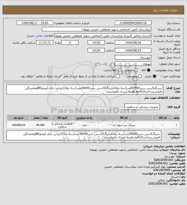 استعلام سرنگ5سی سی50000عدد(سه تیکه)سرنگ10سی سی30000عدد(سه تیکه).ایرانی داری آیمدوIRCونمایندگی فروش.پرداخت3تا4ماه.هزینه ارسال بافروشنده, استعلام سرنگ5سی سی50000عدد(سه تیکه)سرنگ10سی سی30000عدد(سه تیکه).ایرانی داری آیمدوIRCونمایندگی فروش.پرداخت3تا4ماه.هزینه ارسال بافروشنده