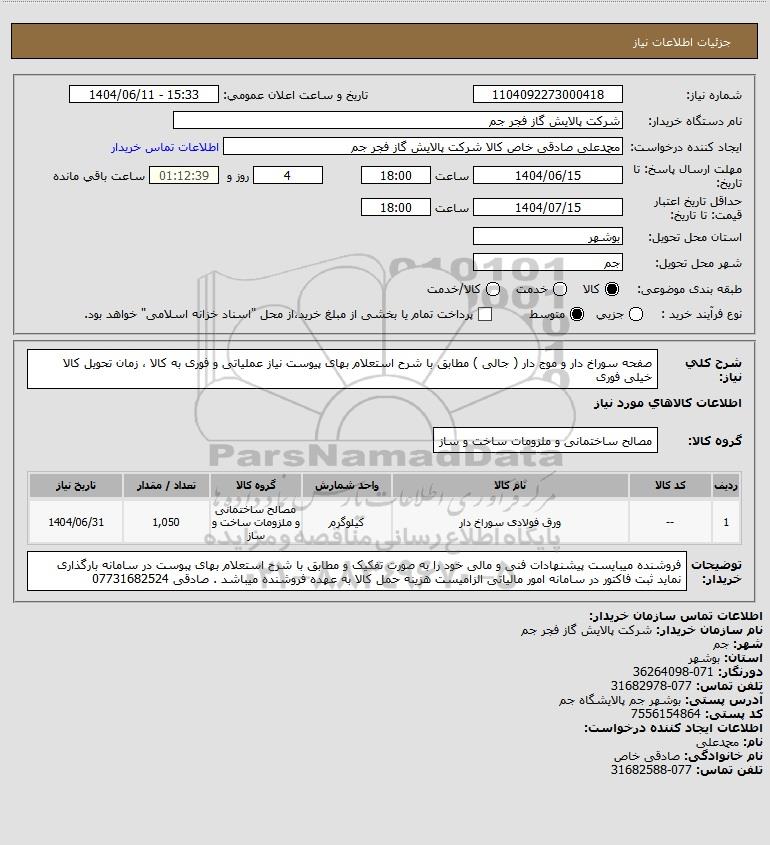 شرح کلی نیاز: صفحه سوراخ دار و موج دار ( جالی ) مطابق با شرح استعلام بهای پیوست نیاز عملیاتی و فوری به کالا ، زمان تحویل کالا خیلی فوری