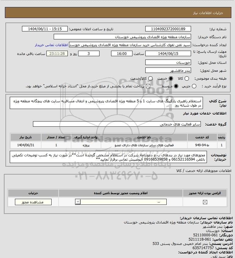 شرح کلی نیاز: استعلام راهبری پارکینگ های سایت 1 و 5 منطقه ویژه اقتصادی پتروشیمی و انتقال مسافربه سایت های پنچگانه منطقه ویژه در طول شبانه روز