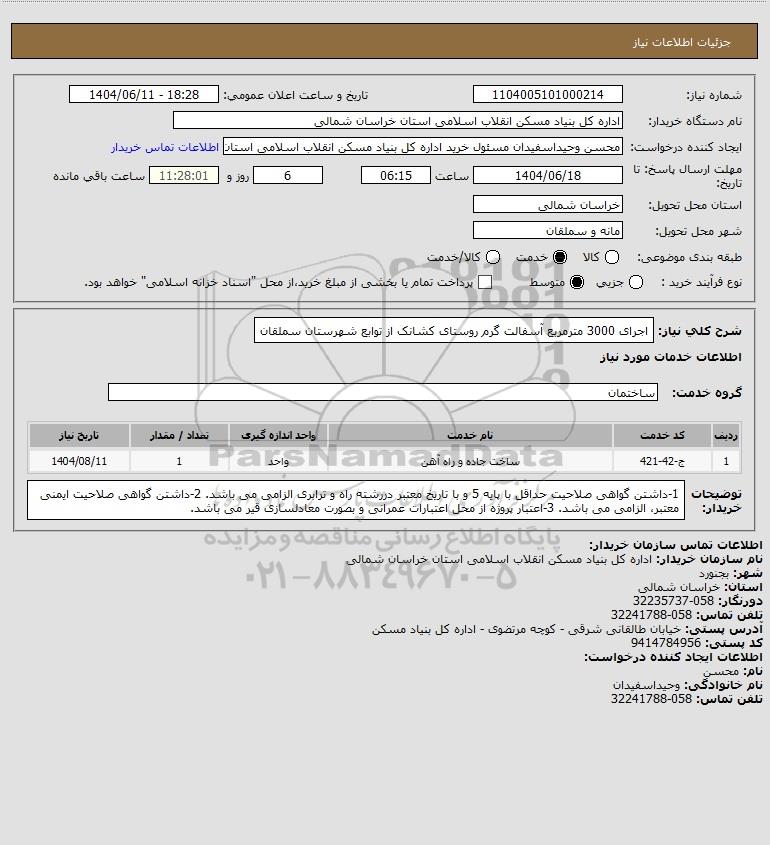 شرح کلی نیاز: اجرای 3000 مترمربع آسفالت گرم روستای کشانک از توابع شهرستان سملقان
