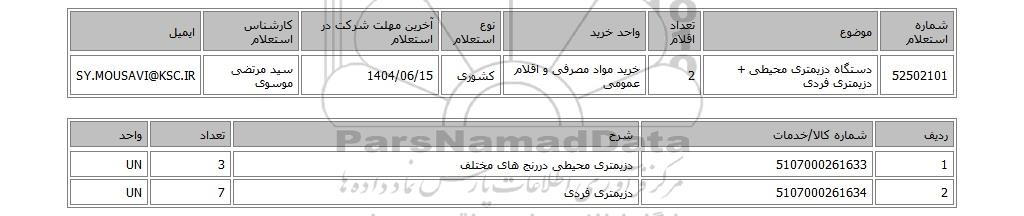 | 52502101 | دستگاه دزیمتری محیطی + دزیمتری فردی | 2 | خرید مواد مصرفی و اقلام عمومی | کشوری | 1404/06/15 | سید مرتضی موسوی | SY.MOUSAVI@KSC.IR |
