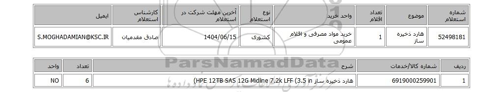 52498181هارد ذخیره ساز1خرید مواد مصرفی و اقلام عمومیکشوری1404/06/15صادق مقدمیانS.MOGHADAMIAN@KSC.IR