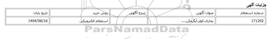 | 171202 | بخاری،کولر،آبگرمکن،... | استعلام الکترونیکی | 1404/06/16 |