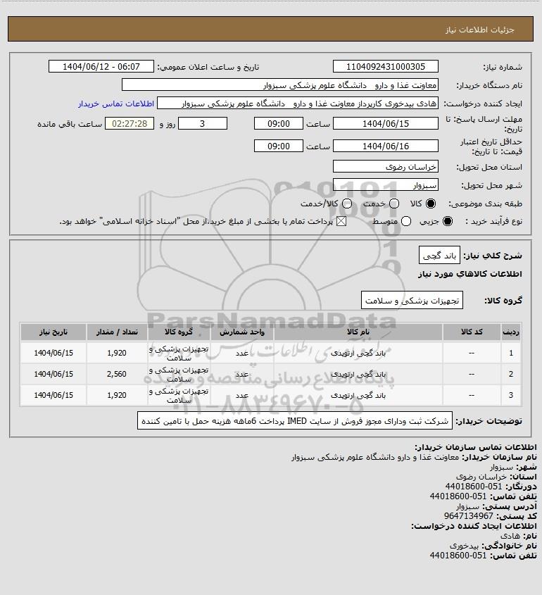 | 2 | -- | باند گچی ارتوپدی | عدد | تجهیزات پزشکی و سلامت | 2,560 | 1404/06/15 |