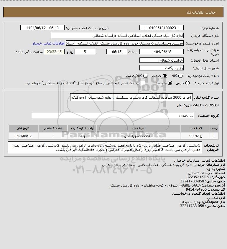 شرح کلی نیاز: اجرای 3000 مترمربع آسفالت گرم روستای سنگسار از توابع شهرستان رازوجرگلان