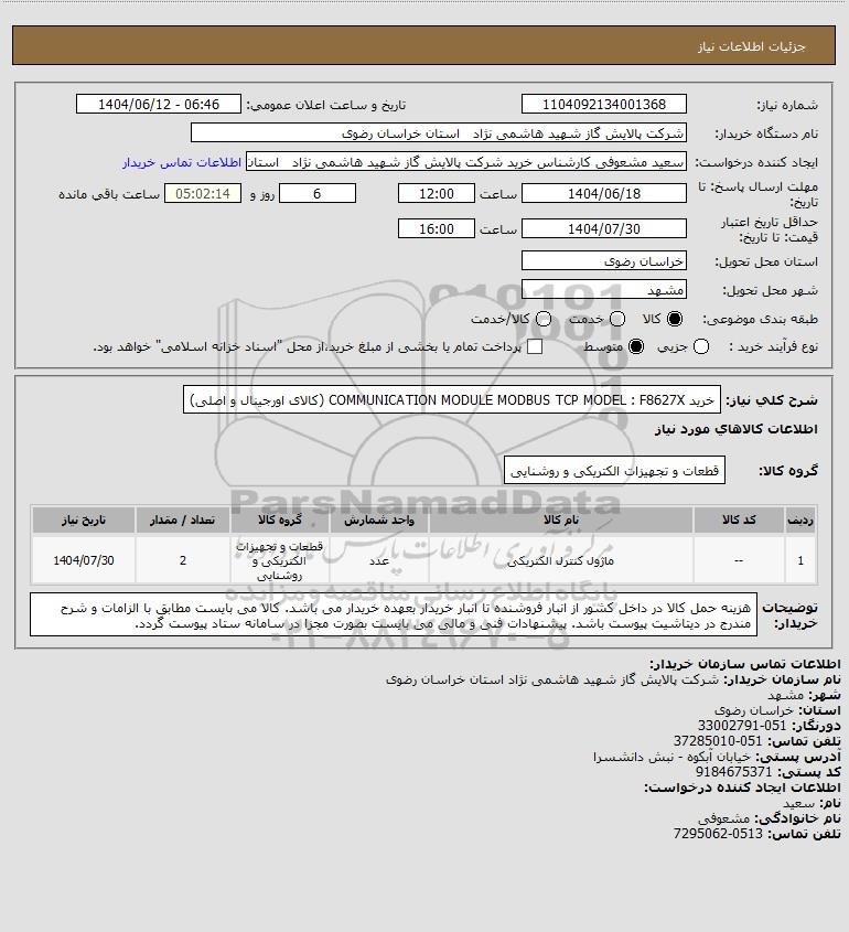 نام دستگاه خریدار:شرکت پالایش گاز شهید هاشمی نژاد استان خراسان رضوی