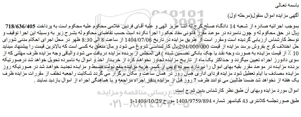 بموجب اجرائیه صادره از شعبه 14 دادگاه صلح کرج له آتنا عزیز الهی و علیه آقای فردین غلامی محکوم علیه محکوم است به پرداخت 718/636/405  ریال در حق محکوم له و چون نامبرده در موعد مقرر قانونی مفاد حکم را اجرا نکرده است حسب تقاضای محکوم له بشرح زیر به وسیله این اجرا توقیف و توسط کارشناس ارزیابی گردیده است ومقرر است از طریق مزایده در تاریخ 1404/07/06 از ساعت 8 الی 8:30 ظهر در محل اجرای احکام مدنی شورای حل اختلاف کرج بفروش برسد مزایده از قیمت 294/000/000ریال کارشناسی شروع می شود و مال متعلق به کسی است که بالاترین قیمت را پیشنهاد میناید 10 ٪ از قیمت مزایده به صورت وجه نقد یا چک بانکی تضمین شده ) فی المجلس از برنده مزایده دریافت می شود والباقی وجه مزایده ظرف مهلتی که از سوی دادورز اجراء تعیین میگردد و حداکثر یک ماه از تاریخ مزایده تجاوز نخواهد کرد از خریدار اخذ و اموال به نامبرده تحویل خواهد شد درصورتیکه برنده مزایده در موعد مقرر بقیه بهای اموال را نپردازد سپرده اوپس از کسر هزیه مزایده بنفع دولت ضبط و مزایده تجدید خواهد شد در صورتیکه روز مزایده مصادف با ایام تعطیل شود مزایده فردای اداری همان روز در همان ساعت و مکان برگزار می گردد شکایت راجعبه تخلف از مقررات مزایده ظرف یک هفته از نخواهد شد ضمنا طالبین می توانند ظرف 7 روز قبل از مزایده بدفتر اجراء مراجعه و با هماهنگی اجراء از اموال بازدید نمایند .