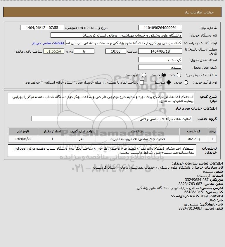 شرح کلی نیاز: استعلام اخذ مشاور ذیصلاح برای تهیه و تنظیم طرح توجیهی طراحی و ساخت بونکر دوم دستگاه شتاب دهنده مرکز رادیوتراپی بیمارستانتوحید سنندج-
