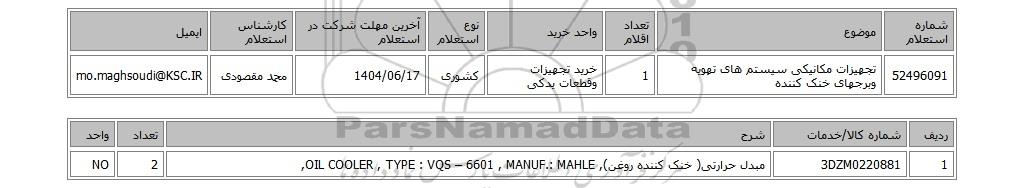 | 1 | 3DZM0220881 | مبدل حرارتی( خنک کننده روغن), OIL COOLER , TYPE : VQS – 6601 , MANUF.: MAHLE, | 2 | NO |