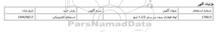 | 170613 | لوله فولادی بدون درز سایز 1.1/2 اینچ | استعلام الکترونیکی | 1404/06/17 |