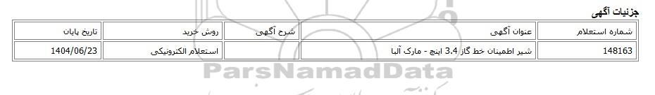 | 148163 | شیر اطمینان خط گاز 3.4 اینچ - مارک آلبا | استعلام الکترونیکی | 1404/06/23 |