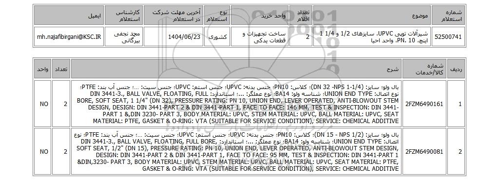 | 52500741 | شیرآلات توپی UPVC، سایزهای 1/2 و 1/4 1 اینچ، PN. 10، واحد احیا | 2 | ساخت تجهیزات و قطعات یدکی | کشوری | 1404/06/23 | محمد نجفی بیرگانی | mh.najafibirgani@KSC.IR |