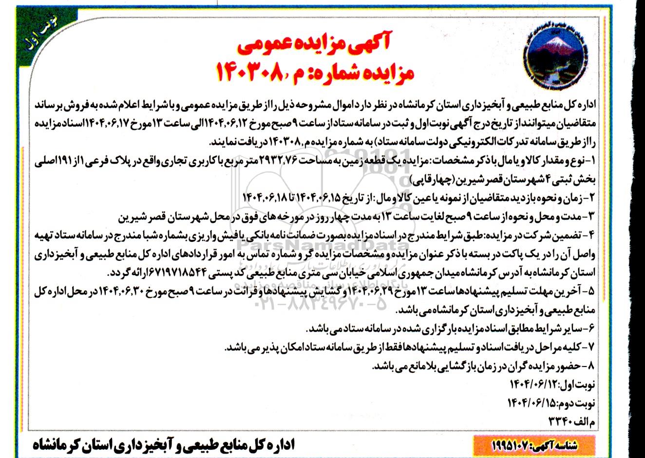 اداره کل منابع طبیعی و آبخیزداری استان کرمانشاه در نظر دارد اموال مشروحه ذیل را از طریق مزایده به فروش برساند
