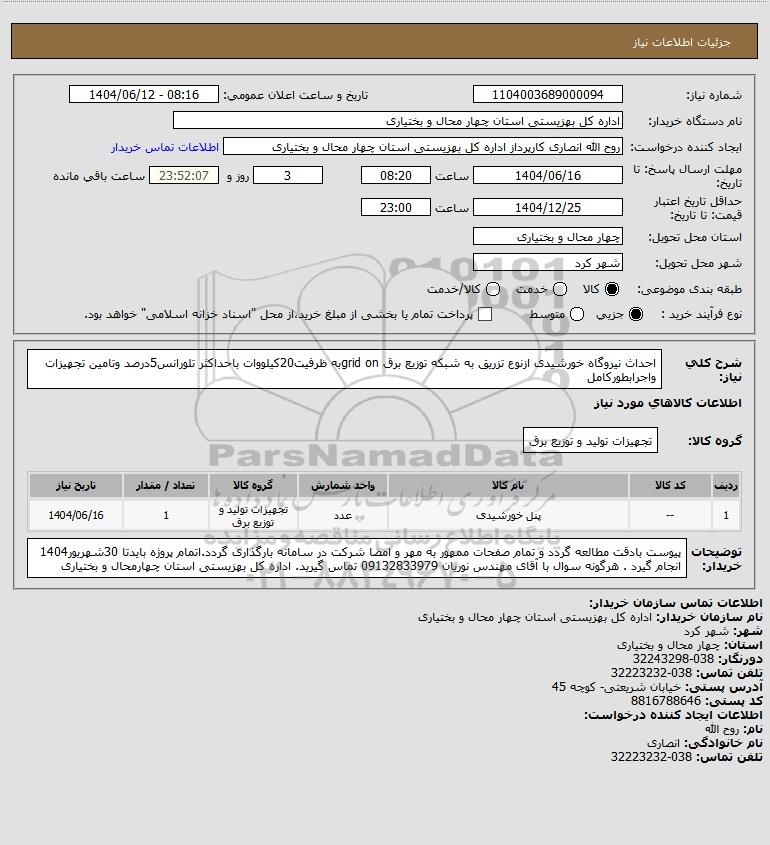 | 1 | -- | پنل خورشیدی | عدد | تجهیزات تولید و توزیع برق | 1 | 1404/06/16 |