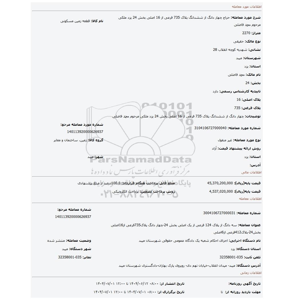 شرح مورد معامله: حراج چهار دانگ از ششدانگ پلاک 735 فرعی از 16 اصلی بخش 24 یزد ملکی مرحوم محمد فاضلینام کالا: قطعه زمین مسکونی