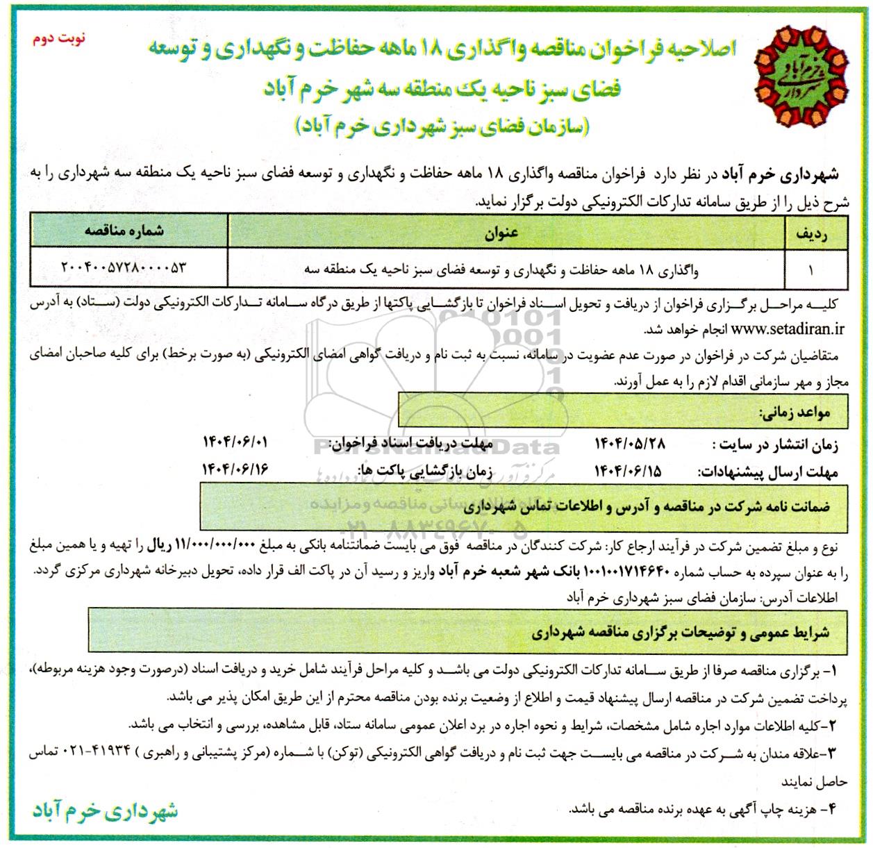 اصلاحیه فراخوان مناقصه واگذاری 18 ماهه حفاظت و نگهداری و توسعه فضای سبز ناحیه یک منطقه سه شهر خرم آباد ؟ نوبت دوم