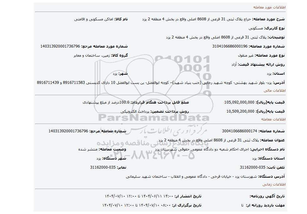 | شرح مورد معامله: حراج پلاک ثبتی 31 فرعی از 8608 اصلی واقع در بخش 4 منطقه 2 یزد | نام کالا: اماکن مسکونی و اقامتی | |
