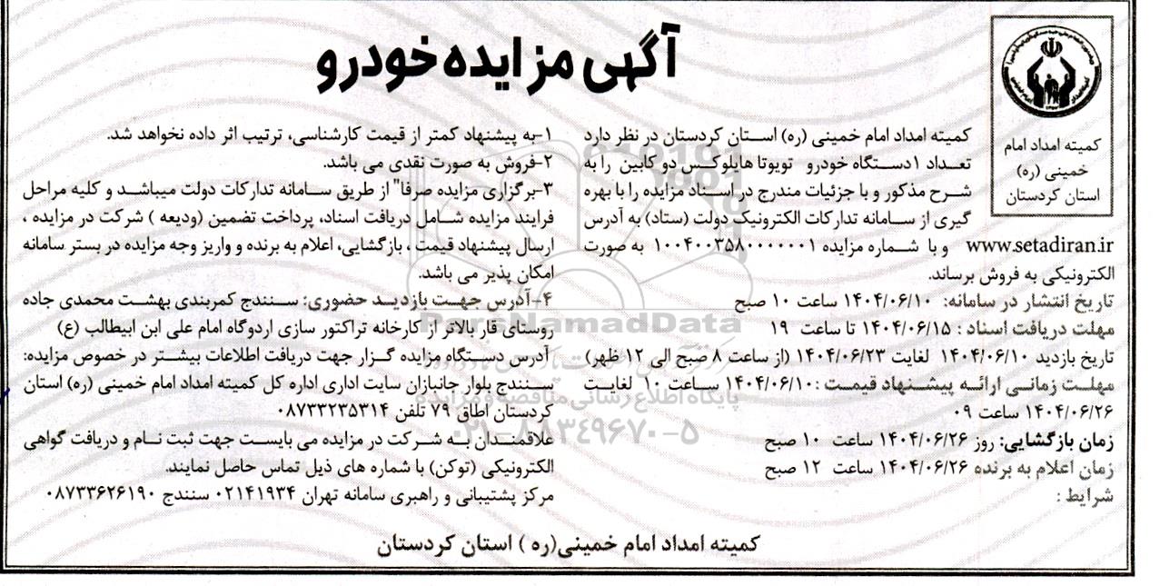 کمیته امداد امام خمینی (ره) استان کردستان در نظر دارد تعداد 1 دستگاه خودرو تویوتا هایلوکس دو کابین را به شرح مذکور و با جزئیات مندرج در اسناد مزایده را با بهره گیری از سامانه تدارکات الکترونیک دولت (ستاد به آدرس سایت ستاد ایران ) و با شماره مزایده 1004003580000001 به صورت الکترونیکی به فروش برساند.