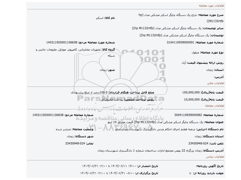 | عنوان معامله: یک دستگاه چاپگر اسکنر مشکی مدل (hp M1132mfp)) قیمت مونیتور 14 اینچ | ||