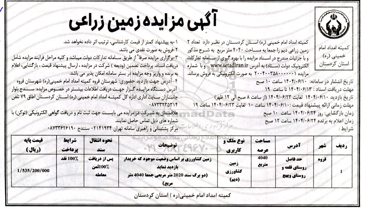 مزایده فروش دو زمین زراعی دیم مساحت 4040 مترمربع