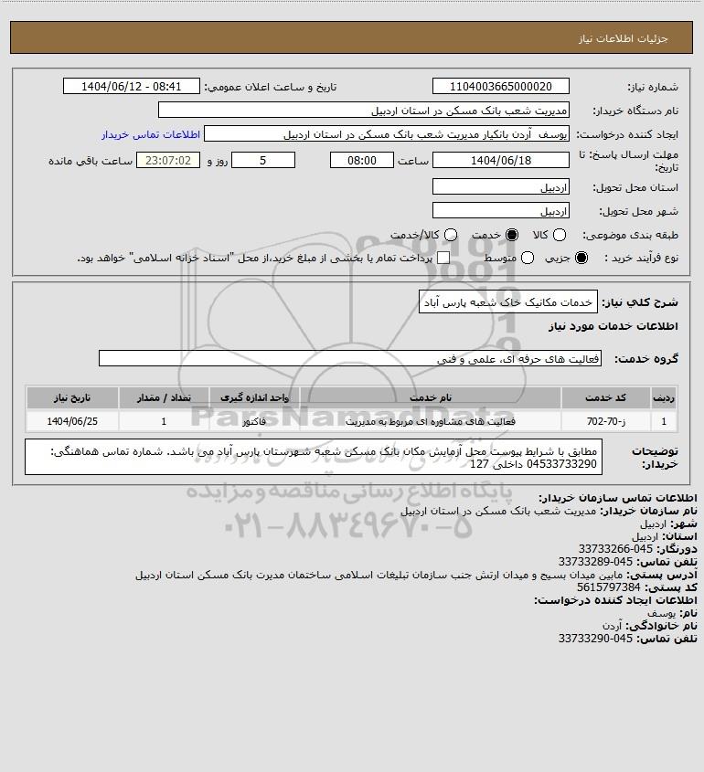شرح کلی نیاز: خدمات مکانیک خاک شعبه پارس آباد