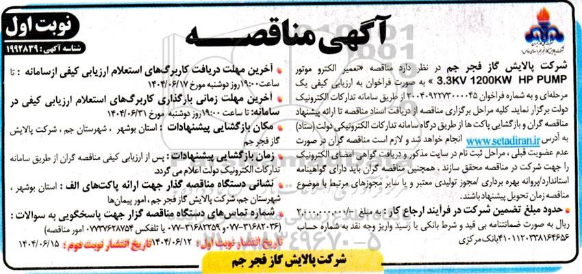 شرکت پالایش گاز فجر جم در نظر دارد مناقصه «تعمیر الکتروموتور 3.3KV 1200KW HP PUMP» به صورت ارزیابی کیفی یک مرحله ای و به شماره فراخوان 2004092273000045 از طریق سامانه تدارکات الکترونیک دولت برگزار نماید. کلیه مراحل برگزاری مناقصه از دریافت اسناد مناقصه تا ارائه پیشنهاد مناقصه گران و بازگشایی پاکت ها از طریق درگاه سامانه تدارکات الکترونیکی دولت انجام خواهد شد و لازم است مناقصه گران در صورت عدم عضویت قبلی ، مراحل ثبت نام در سایت مذکور و دریافت گواهی امضای الکترونیک را جهت شرکت در مناقصه محقق سازند. همچنین مناقصه گران باید دارای مجوز لازم از سازمان های مربوطه و یا تفاهم نامه با شرکت های دارای تاییدیه از سازمان حفاظت محیط زیست در خصوص عملیات امحای پسماند با موضوع مناقصه در زمان تحویل پیشنهاد باشند.