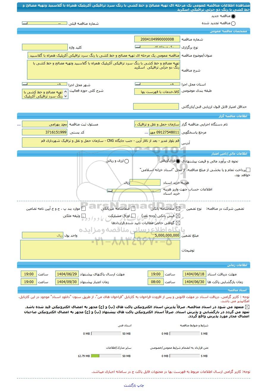 | نام دستگاه اجرایی مناقصه گزار | سازمان حمل و نقل و ترافیک شهرداری قم | مسئول ثبت مناقصه | محمد بهرامی |