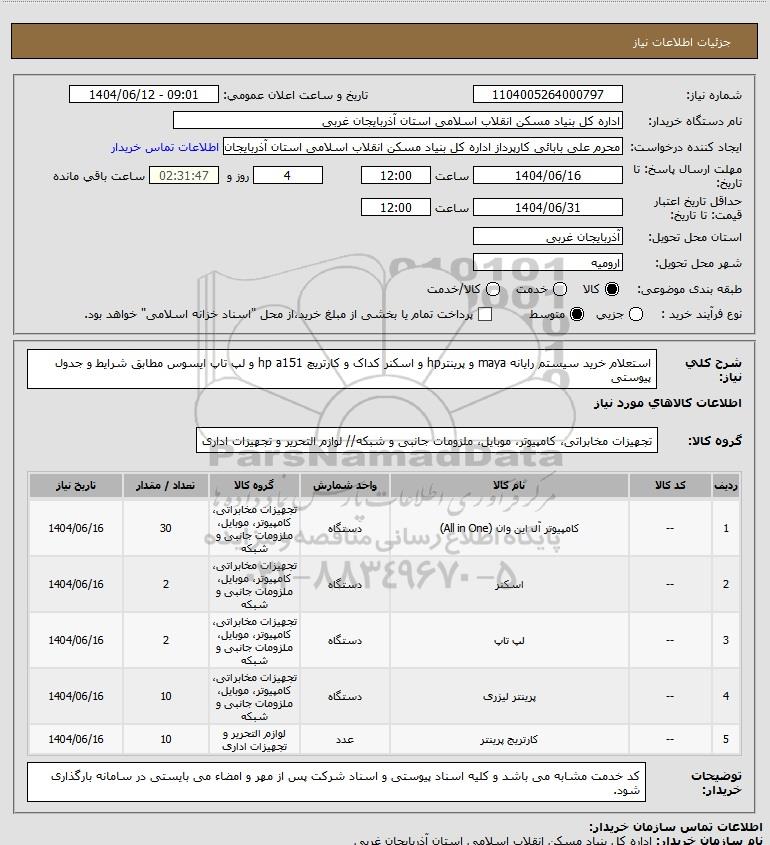 استعلام استعلام خرید سیستم رایانه maya و پرینترhp و اسکنر کداک و کارتریچ hp a151 و لپ تاپ ایسوس مطابق شرایط و جدول پیوستی, استعلام استعلام خرید سیستم رایانه maya و پرینترhp و اسکنر کداک و کارتریچ hp a151 و لپ تاپ ایسوس مطابق شرایط و جدول پیوستی