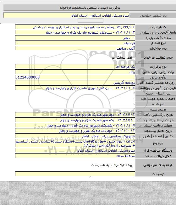 مناقصه اجرای ( دیوار چینی +نعل درگاه+وال پست+میلگرد بستر)+شاسی کشی آسانسور + قسمتی از نما ۵۶ واحد ( بلوکA ( از کلیه افراد متخصص و شرکتها واجد شرایط دعوت به عمل میآید در مناقصه با کد خبرگزاری پارس نماد: 9493615 شرکت نمایند.