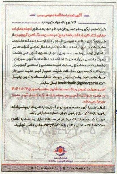 شرکت همیار گهر حدید سیرجان (سهامی خاص) در نظر دارد به منظور انجام عملیات حفاری آتشکاری با قطر 8.5( اینچ) در معدن سنگ آهن گهر زمین از طریق برگزاری مناقصه عمومی اقدام به اجاره سه دستگاه حفاری با مشخصات مندرج در اسناد مناقصه نماید لذا از تمامی شرکت هایی که دارای توانایی مناسب سوابق و تجارب مورد قبول می باشند. دعوت به عمل می آید جهت اخذ اسناد مناقصه به نشانی سیرجان، کیلومتر 60 جاده شیراز سایت شرکت معدنی و صنعتی گهرزمین دبیرخانه کمیسیون معاملات شرکت همیار شهر جدید سیرجان مراجعه نمایند.