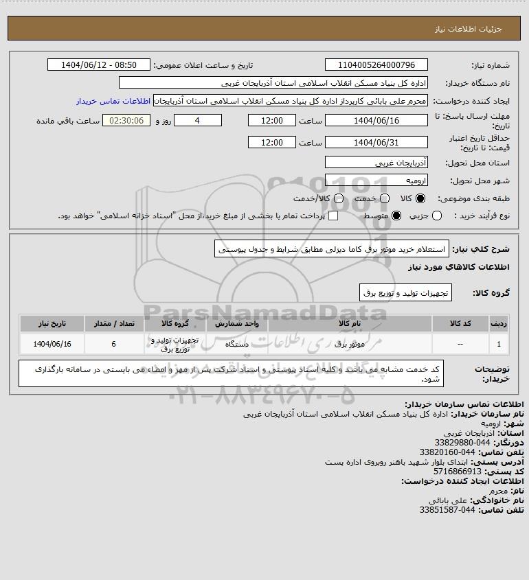 شرح کلی نیاز: استعلام خرید موتور برق کاما دیزلی مطابق شرایط و جدول پیوستی
