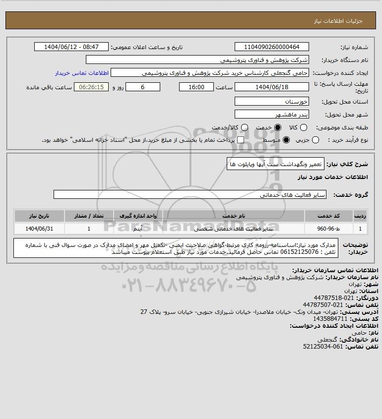 شرح کلی نیاز: تعمیر ونگهداشت ست آپها وپایلوت ها